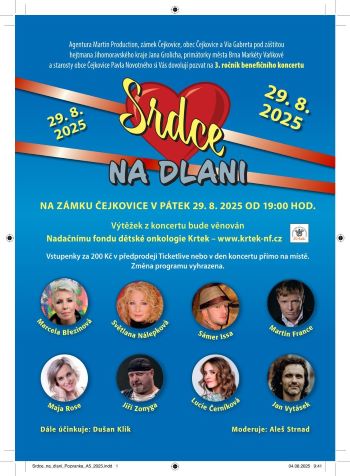 V pátek 29. srpna 2025 od 19:00 hodin se na nádvoří zámku Čejkovice uskuteční už třetí ročník benefičního koncertu „Srdce na dlani“, jehož výtěžek podpoří Nadační fond Krtek pomáhající dětem s onkologickým onemocněním.