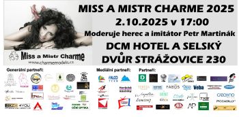 Finále 18. ročníku netradiční a originálně pojaté soutěže krásy těla, ale především duše – MISS A MISTR CHARME 2025 – se uskuteční 2. října v malebném prostředí Hotelu Selský dvůr ve Strážovicích.