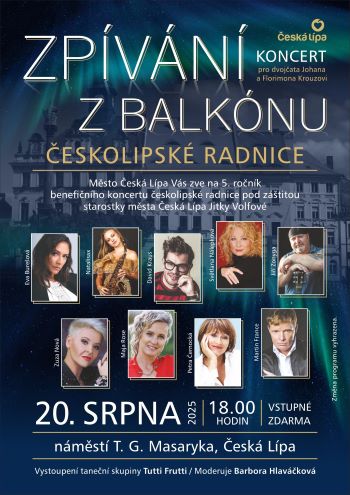 Ve středu 20. srpna 2025 od 18 hodin ožije historická budova radnice v České Lípě tradičním benefičním koncertem Zpívání z balkónu. Letos se koná již pátý ročník této výjimečné akce, která probíhá pod záštitou starostky města Jitky Volfové.