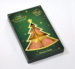 Balení obsahuje paštiku se sýrem Camembert a klikvami, paštiku se srnčím masem a sýrem s modrou plísní a paštiku se sýrem Eidam a zeleným pepřem. Cena vánoční bonboniéry je 64,90 – 74,90 Kč za 150 g balení.
