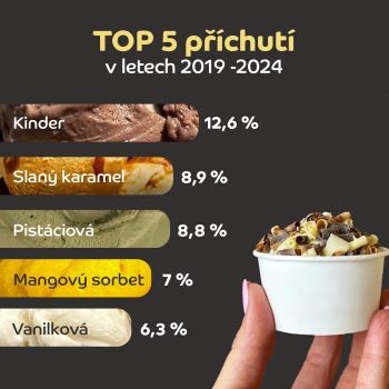 Kdo by na pomyslném stupni vítězů čekal vanilkovou nebo čokoládovou, je vedle. Prvenství si posledních pět let drží příchuť kinder a stejný vývoj se od jarního spuštění prodeje rýsuje i letos. Po kombinaci čokolády, bílé čokolády a lískových oříšků navíc podle zmrzlinářů nesahají děti, ale především dospělí.