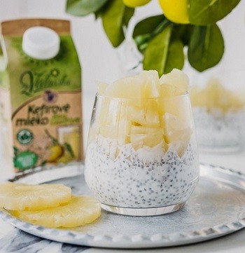Do uzavíratelné nádoby nasypeme chia semínka, která zalijeme kefírovým mlékem. Nádobu uzavřeme, dáme ji do lednice a necháme chia semínka nasát svěží kefír ideálně přes noc. Chia semínka tak nabobtnají, zvětší svůj objem a vytvoří puding. Hotový puding přendáme do sklenice a ozdobíme jej čerstvým nebo konzervovaným ananasem dle chuti a dostupnosti.