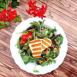 Salát s hořčično-jogurtovou zálivkou, brusinkami a grilovaným sýrem
