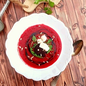 V hrnci rozpalte potřebné množství oleje a orestujte na něm nahrubo nakrájenou cibuli. Až začne cibule zlátnout, přidejte nahrubo nasekaný česnek a společně dopečte. Poté vlijte plechovku rajčat a na menší kostky nakrájenou červenou řepu a krátce provařte. Přidejte část vývaru a rozmixujte na hladké pyré. Poté přidejte zbylou část vývaru a dochuťte balsamikem a solí dle vlastní chuti. Na talíři polévku posypte semínky a přidejte nadrobenou Lučinu (doporučujeme jednu kostičku mini na jednu porci polévky).