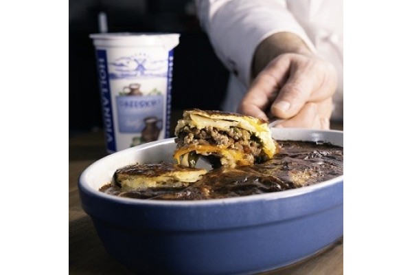 2. Na oleji zpěníme cibuli, přidáme mleté maso a drcená rajčata a společně provaříme. Do vymazaného pekáčku skládáme postupně brambory, zeleninu a směs s mletým masem. Každou vrstvu přikryjeme listy mladého špenátu. Poslední vrstvu tvoří brambory.