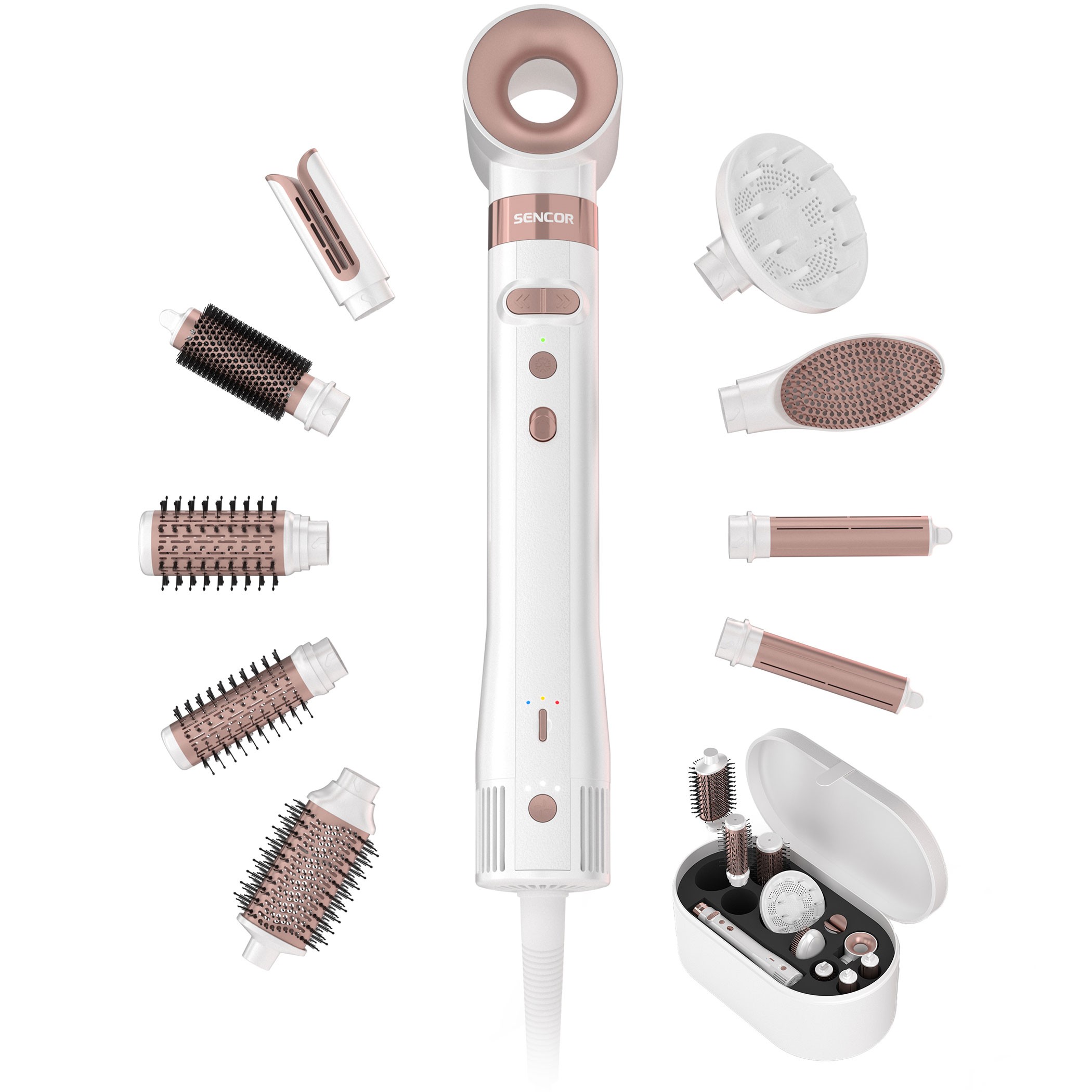 Součástí balení je deset nástavců, díky nimž jeden přístroj zastane hned několik funkcí. Nechybí hlavice pro rychlé vysoušení vlasů, difuzér pro kudrnaté vlasy ani nástavec pro vyhlazení a narovnání.