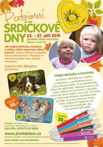 V týdnu od 23. do 27. září se po celé ČR naplno rozbíhají podzimní Srdíčkové dny. Tradiční sbírka organizace Život dětem pomáhá rodinám s vážně nemocnými dětmi a zapojit se do ní může úplně každý. Tváří podzimní části se staly sestřičky Karolínka a Michalka. Obě dívky trpí nevyléčitelnou nemocí zvanou mukopolysacharidózou.