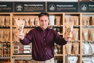 Sám se postavil k pražičce a za asistence své baristky Moniky Matúšové začal vytvářet kávové směsi Zlaté Zrnko, které chutnají každý den v roce, v každém ročním období a také za další rok stejně dobře. Má jich aktuálně deset a nazývají se jako postavy ze Shakespearových děl. „Směs není ve světě kávy, tedy určitě ne v tom našem, hanlivé pojmenování. Skládá se z kávových zrn pocházejících od farmářů, které známe, a deset jich je proto, aby si u nás každý našel kávu takové chuti, jakou preferuje, například ovocnou, hořkou či sladkou,“ zapojuje se do vyprávění i baristka Monika a mezitím nám nabídne kávu, do které nám po prvním doušku doporučí cukr a mléko.