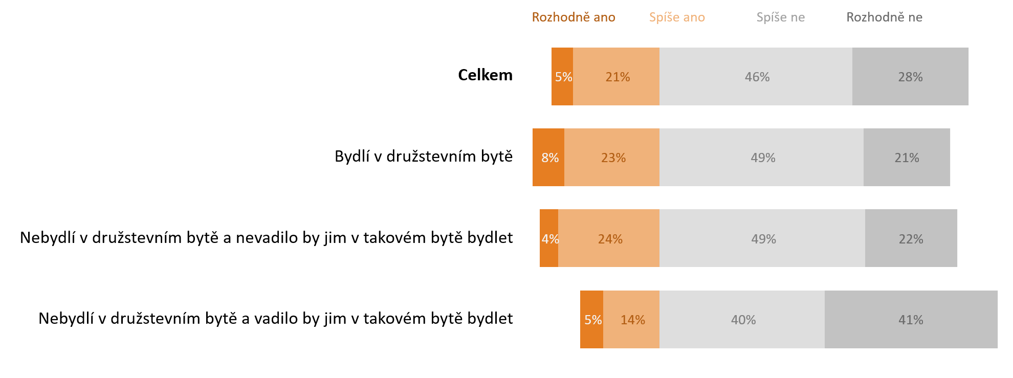 Z loňského průzkumu Raiffeisen stavební spořitelny a výzkumné agentury NMS Market Research vyplynulo, že 15 % Čechů bydlí v družstevním bytě a 64 % z těch, kteří žijí jinak, by tento způsob bydlení nevadil. Nejvíce jsou mu naklonění lidé v Praze, naopak nejméně populární je ve východních Čechách a na Vysočině.