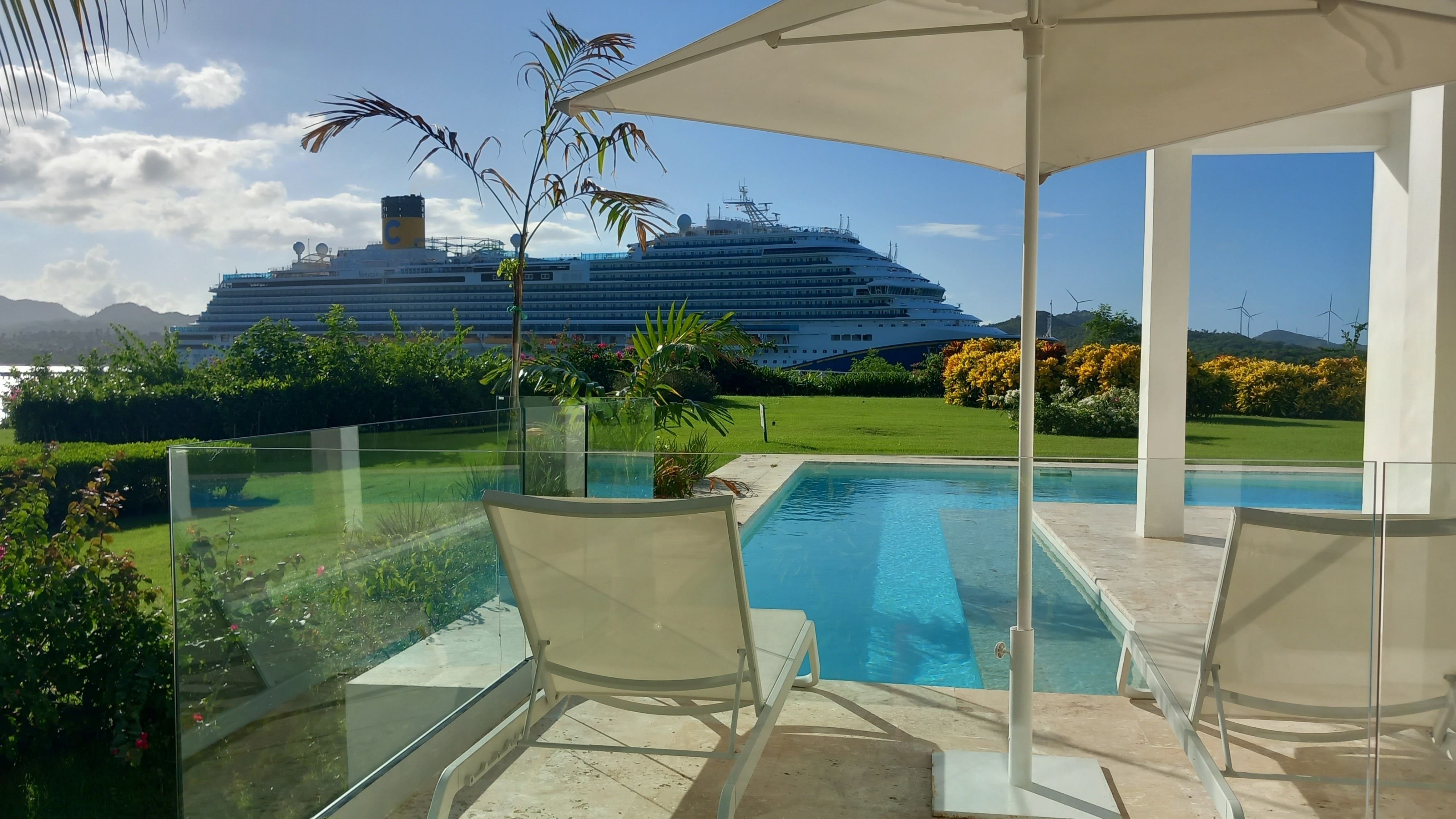 Opět poněkud jiný druh romantiky nabídne přístav Puerto Plata: občasný hlučný signál lodních sirén ohlašuje příjezd, či naopak odplouvání obrovských zámořských „superhotelů“, jež se Karibikem toulají od jednoho atraktivního cíle k druhému. My jsme tu zastihli obří plavidlo až z Itálie… Snění o dálkách, které taková plavidla iniciují, je jistě nevyhnutelné v takovém pokoji, z něhož vede pár schodů rovnou do bazénku suplujícího terasu, jemuž bezprostřední kulisu vytváří právě kotvící zámořský kolos…