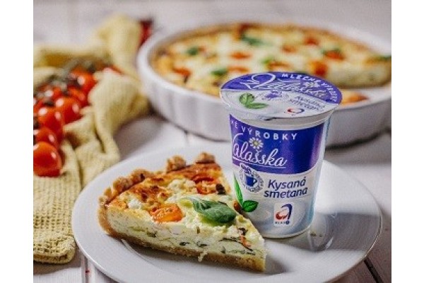 Formu vymažeme tukem a vysypeme moukou. V míse smícháme sypké suroviny na těsto, přidáme změklé máslo a vodu. Vypracujeme hladkou hmotu, kterou uložíme na 30 minut do chladu. Z těsta vyválíme placku a tou vyplníme formu (průměr 26-28 cm) tak, aby sahalo až k okrajům. Těsto po celé ploše propíchneme vidličkou a přesahující okraje seřízneme nožem. Pečeme v předehřáté troubě na 180 °C 15 minut. Do mísy rozklepneme vejce, přidáme Kysanou smetanu z Valašska a zbytek surovin určených pro náplň. Směs vyšleháme, abychom se zbavili nechtěných hrudek. Na upečené těsto nalijeme směs s vejci a ozdobíme rozpůlenými cherry rajčátky a na kostičky nakrájenou fetou. Pečeme na 160 °C přibližně 45-50 minut.