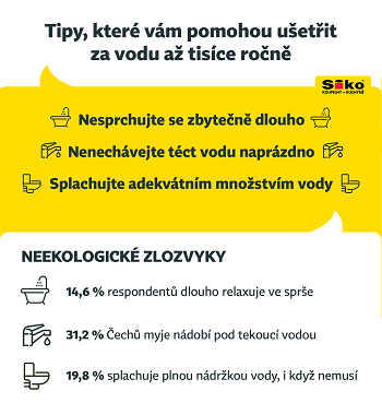 Voda protékající kohoutky s sebou odplavuje také peníze z našich peněženek. Nejnovější průzkum společnosti SIKO KOUPELNY & KUCHYNĚ zjistil, že šetření vodou je důležité pro 83 procent Čechů. Na druhou stranu se o způsoby, jak vodou šetřit, aktivně zajímá pouze jeden z deseti dotázaných. Nižší spotřeba vody by přitom pomohla nejen přírodě, ale také našim peněženkám.
