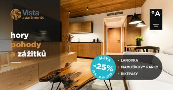 Kromě toho mají hosté letos v létě také možnost využít slevu 25 % na zážitky. Každý ubytovaný host Vista Apartments bude mít automaticky o čtvrtinu levnější lanovku, bikepasy a vstup do Mamutíkových zážitkových parků.
